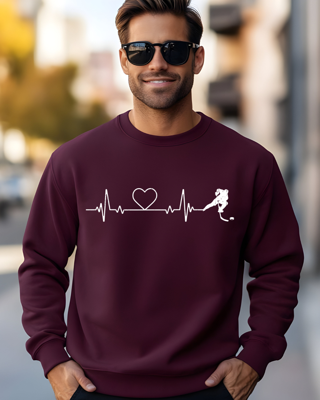 Stand out with our exclusive heartbeat graphic that intertwines with a hockey stick, making a bold statement about your love for the game.